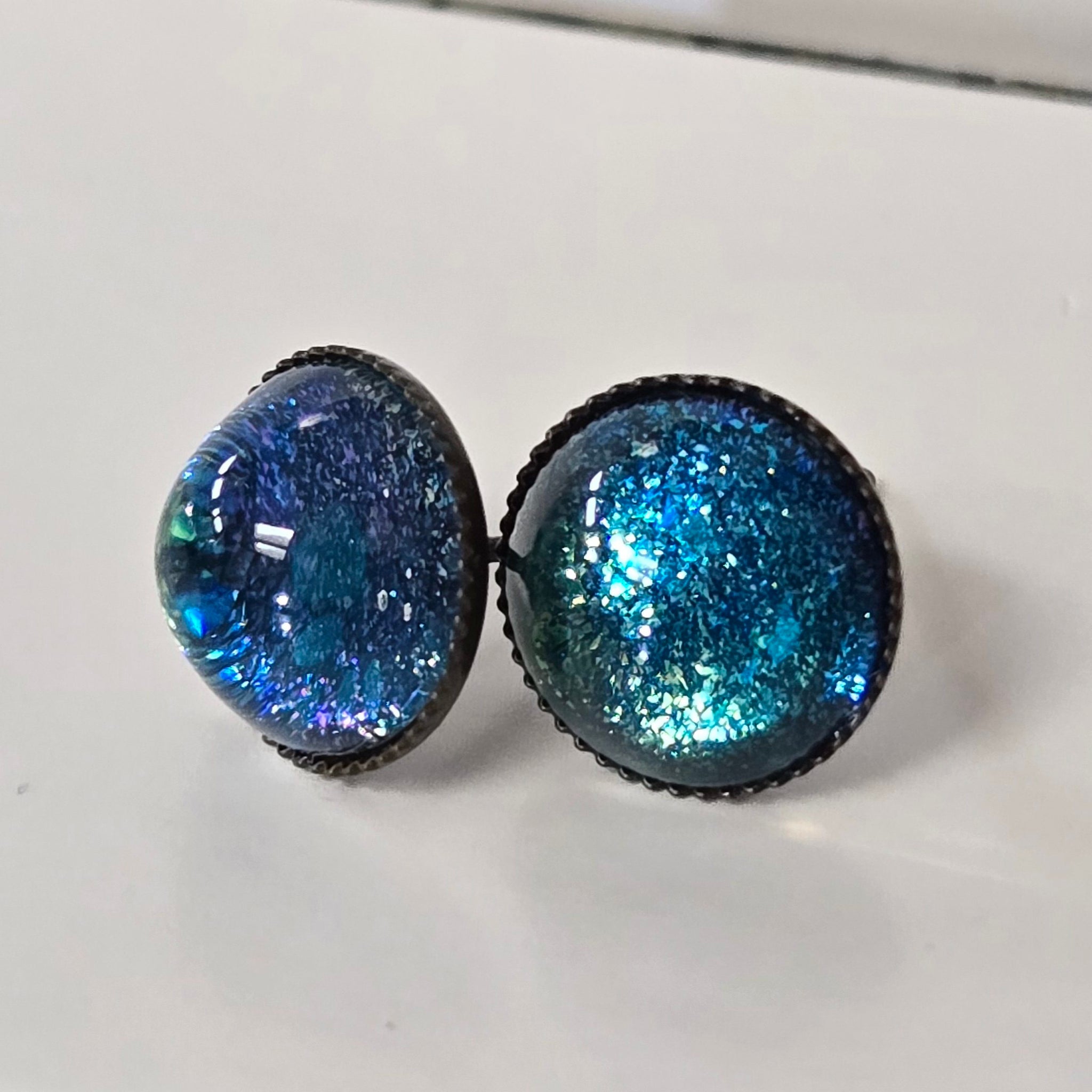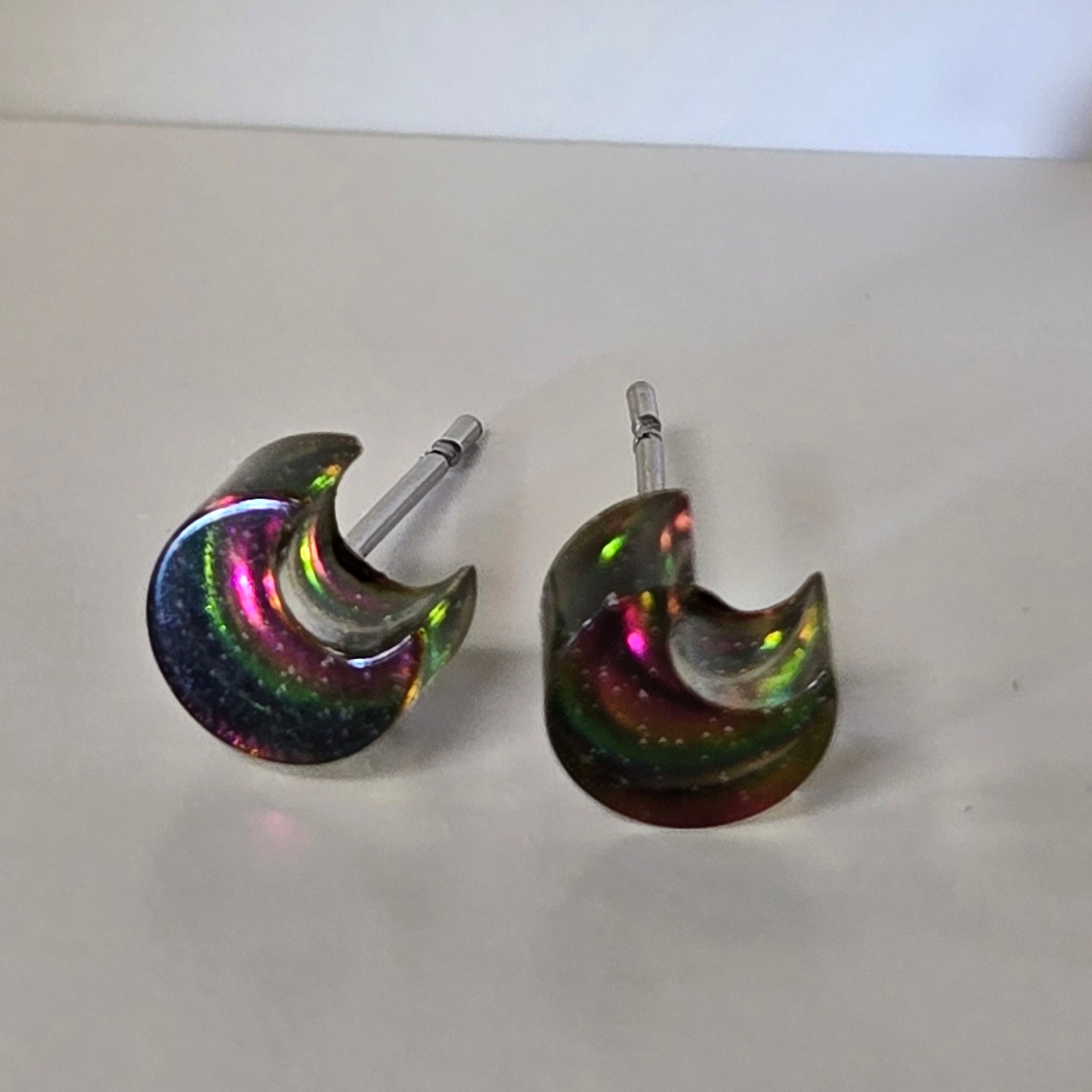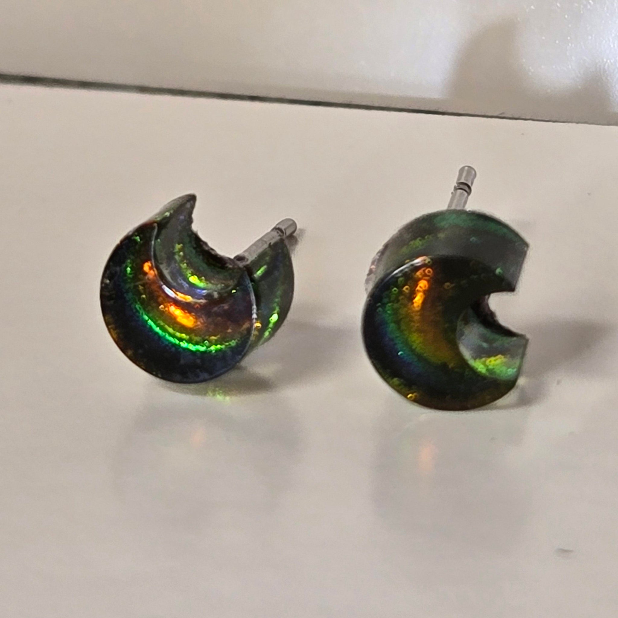 OGUP (red-orange/gold/green/blue) or another rare multichrome pigment (green/blue/purple/red/bronze) encased in resin. These now also come in holographic black! Earring studs are made of stainless steel, which...